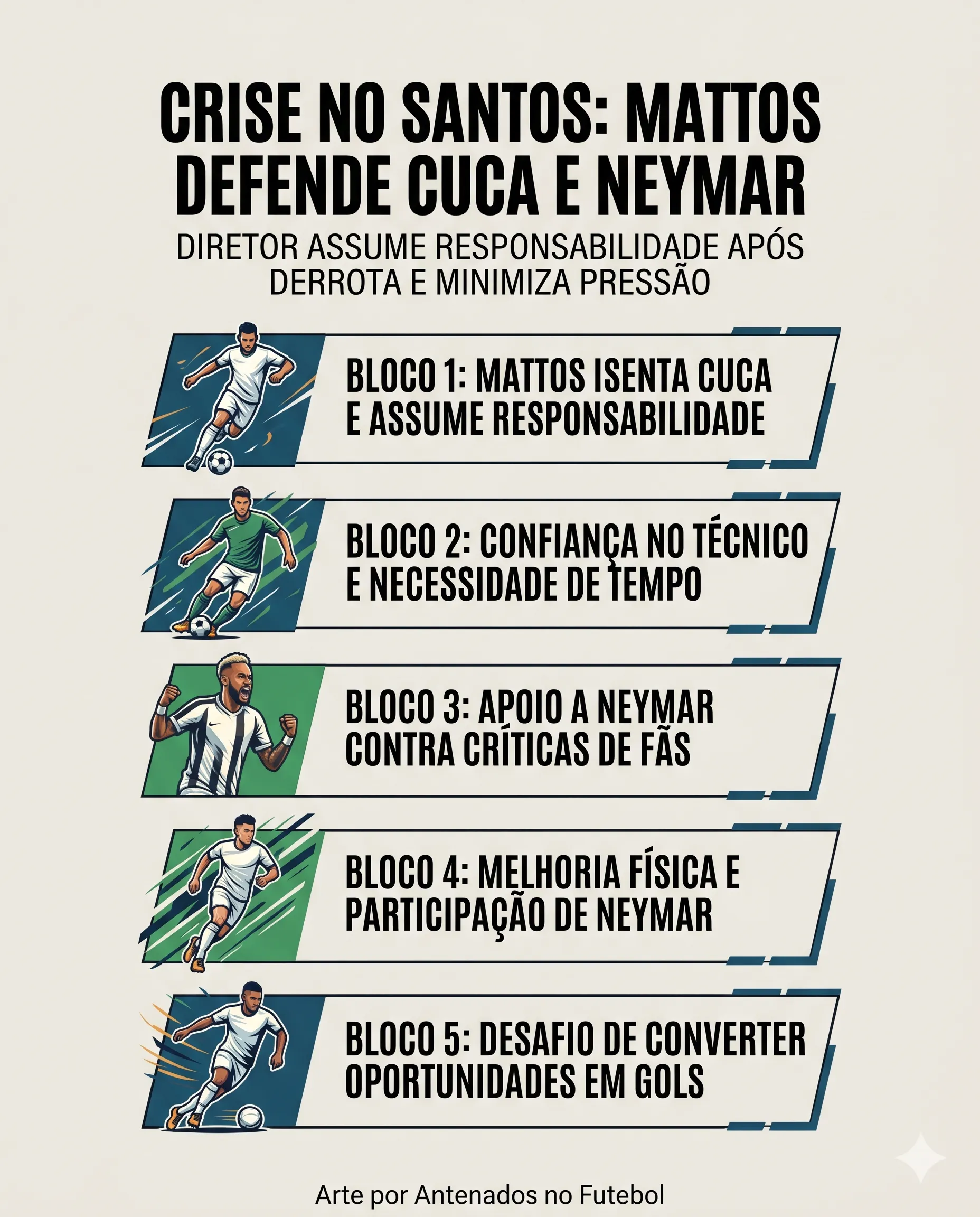 A postura de Alexandre Mattos ao assumir a responsabilidade e blindar o técnico Cuca é uma estratégia correta para dar estabilidade a um trabalho que está apenas começando. Trocar a comissão técnica agora ou permitir que a pressão sobre Neymar desestabilize o vestiário apenas aceleraria a queda na tabela do Brasileirão. O foco total deve ser o ajuste defensivo, já que o time “deixa de matar o jogo” e acaba punido, mas a evolução física e o apoio ao comando técnico são os únicos caminhos para afastar o Santos da proximidade com a zona de rebaixamento.