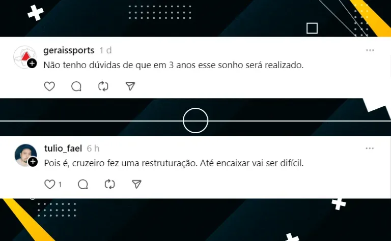 “Não estou falando desse ano, mas de dois anos para cá. Esse ano tivemos que fazer essa ponte para mudar o patamar, mudar o objetivo. O objetivo do Cruzeiro hoje é tentar uma Libertadores. Se vier um título, beleza”, concluiu.