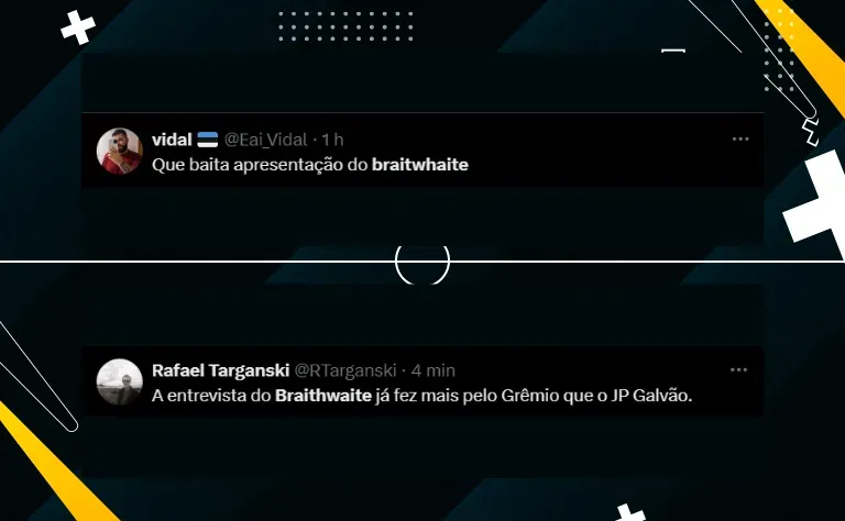 Por fim, cabe ressaltar que com a fala de Antônio Brum, a estreia de Braithwaite foi adiada por duas partidas. Já que após o confronto contra o Athletico, o Grêmio encara o Corinthians na Copa do Brasil, como não foi inscrito a tempo não pode jogar. Assim, a expectativa é para que o centroavante faça seu primeiro jogo contra o Cuiabá no outro sábado (10).