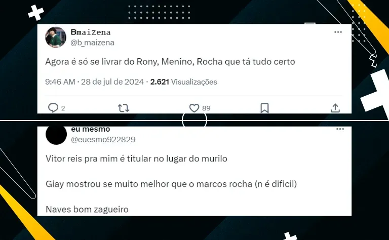 Publicamente, o treinador ‘rasgou elogios’ para Giay, Naves, Vitor Reis e Estêvão. Vale lembrar que o último citado se lesionou no jogo, dessa forma, sua presença no jogo contra o Flamengo pela Copa do Brasil é incerta, ele ainda passará por exames.