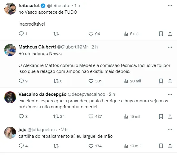 Agora a diretoria vascaína, de acordo com a reportagem, pretende negociar o jogador de 36 anos, já que é considerado que não há mais ambiente para ele dentro do clube. Vale lembrar, que Medel recebe mensalmente R$800 mil.