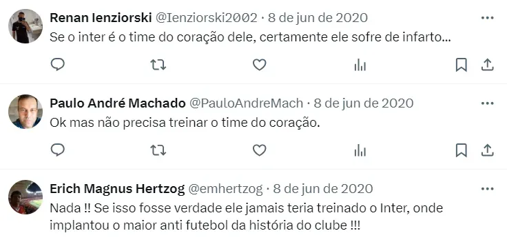 Em uma publicação do perfil “Já Joguei no Inter”, alguns lances da época em que o Argel Fuchs foram publicados. Então, torcedores do Colorado aproveitaram o momento para criticar o treinador.
