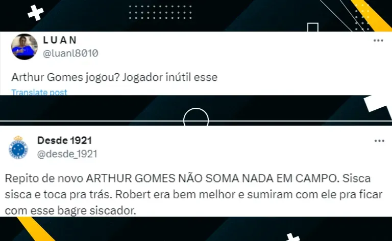 Ainda citando o péssimo resultado, além da cobrança contra Fernando Seabra e Kaio Jorge, outro jogador do elenco virou alvo dos torcedores nas redes sociais: trata-se de Arthur Gomes. Sendo assim, os seguintes comentários contra o jogador vieram à tona (SIC).