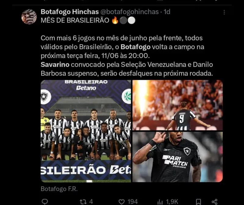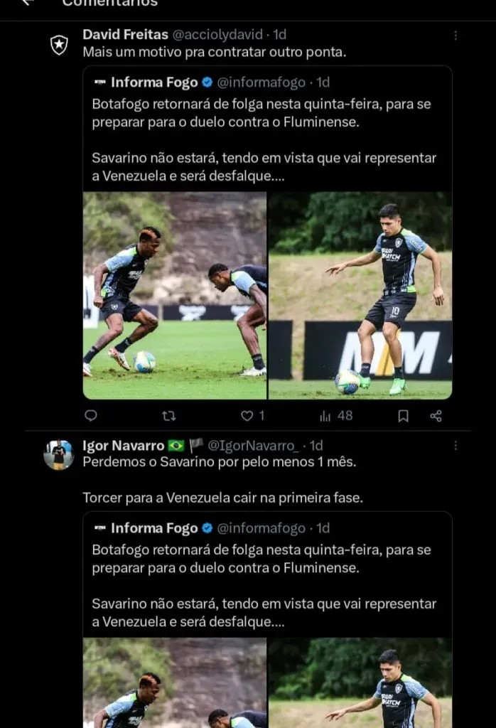Nas próximas três semanas, o Botafogo não contará com a presença de Savarino em seus jogos. O camisa 10 foi convocado pela Seleção Venezuelana para disputar a Copa América.
