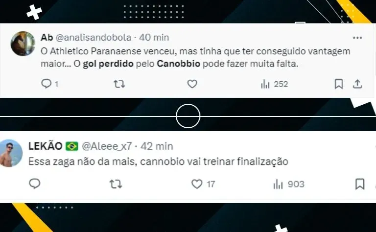 “O Athletico Paranaense venceu, mas tinha que ter conseguido vantagem maior… O gol perdido pelo Canobbio pode fazer muita falta.”, disse um torcedor no Twitter. “Cannobio vai treinar finalização”, pediu outro torcedor.