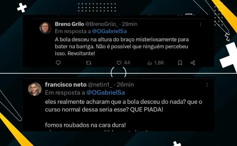 “Primeira jogada, Luiz não faz falta. Antes, houve uma falta em Luciano. E Luiz não fez falta. Não fez falta. E o árbitro dá uma falta. Segunda jogada do gol, claramente pega aqui (na mão), cai aqui (na barriga)”, disse.