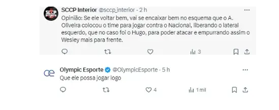 Atualmente, quem vem sendo acionado na lateral esquerda é Hugo, outro nome que foi contratado para a temporada. Já no banco, neste momento a opção imediata tem sido Matheus Bidu, que voltou a fazer parte dos planos do clube.
