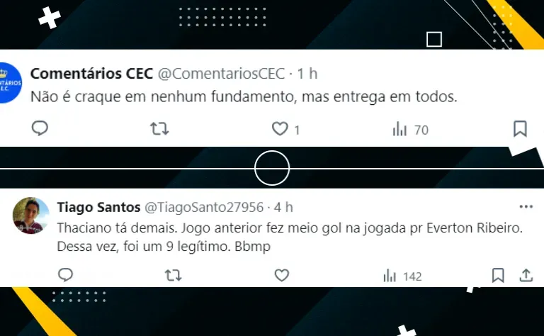 Eu gosto muito do Thaciano. Pela pessoa que ele é, pelo profissional que ele é. Agora está mais acostumado à função que está fazendo, mas já jogou em outras funções com a gente.”, iniciou Rogério.
