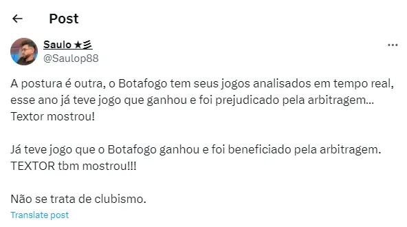 Após o acionista da SAF do Bota questionar a expulsão polêmica de Hulk em Atlético-MG 0 x 4 Palmeiras. O comentarista citado acima não teve medo e cutucou o Textor. Sendo assim, a seguinte fala chegou aos torcedores do Maior do Rio.