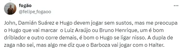 Sendo assim, segundo a fonte, a provável escalação do Botafogo para encarar o Flamengo tem: John, Damián Suárez, Lucas Halter, Bastos (Alexander Barboza) e Hugo; Danilo Barbosa e Tchê Tchê (Marlon Freitas); Luiz Henrique, Eduardo, Júnior Santos e Savarino (Jeffinho).