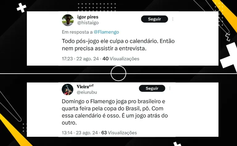 ”O Flamengo vai jogar 11 jogos do Brasileiro sem seus atletas de Seleção. A CBF acha que isso não tem consequência. E ela está enganada. Quando ela faz isso, quando tem jogador do Atlético-MG na seleção, prejudicando o Atlético-MG. Jogador do Flamengo na seleção, esportivamente prejudicando o Flamengo em 11 datas. Ela está arranhando a relação da seleção com os torcedores do Flamengo, do Atlético-MG, do Palmeiras. Ela está causando dano para o produto dela. Ela não enxerga isso”, concluiu Spindel.