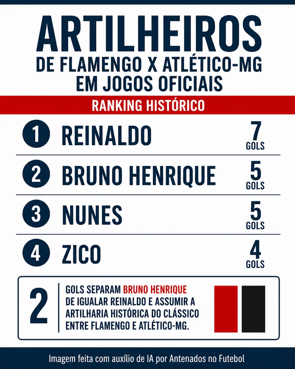 Por sua vez, Reinaldo, ídolo máximo da história do Galo, marcou sete vezes na história do confronto. A lista de artilheiros também conta com a presença pesada de Nunes e Zico, duas lendas rubro-negras. Os números são do site OGol.