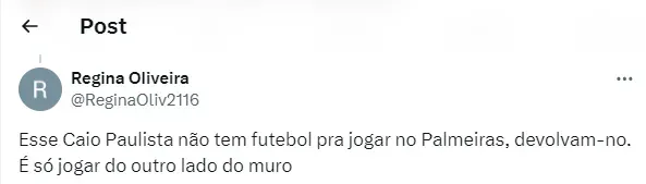 “Esse Caio Paulista não tem futebol pra jogar no Palmeiras, devolvam-no. É só jogar do outro lado do muro”. “Esse cara é ruim demais, espero que melhore nos próximos jogos”. “É um baita bagre, não deveria estar no nosso clube, tem que sumir”.