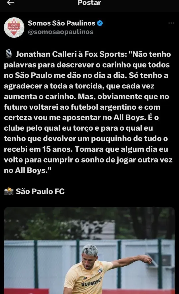 “Não tenho palavras para descrever o carinho que todos no São Paulo me dão no dia a dia. Só tenho a agradecer a toda a torcida, que cada vez aumenta o carinho. Mas, obviamente que no futuro voltarei ao futebol argentino e com certeza vou me aposentar no All Boys”, disse o jogador.