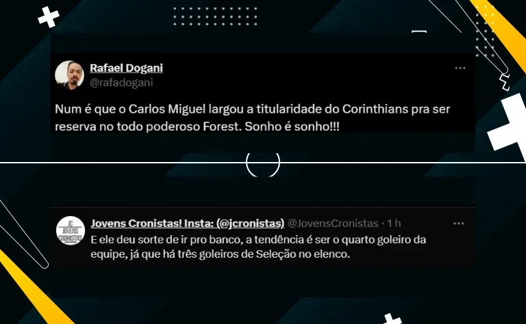 Um torcedor brincou com a situação: “Então o Carlos Miguel gosta mesmo é de ser banco. Viu que ia ser titular no Corinthians e vazou”, escreveu. Já outro foi na mesma linha: “Carlos Miguel saiu do Corinthians para ser reserva do Nottingham Forest? Eu achava que ele seria pelo menos titular (aí faria sentido) mas reserva???”, disse.
