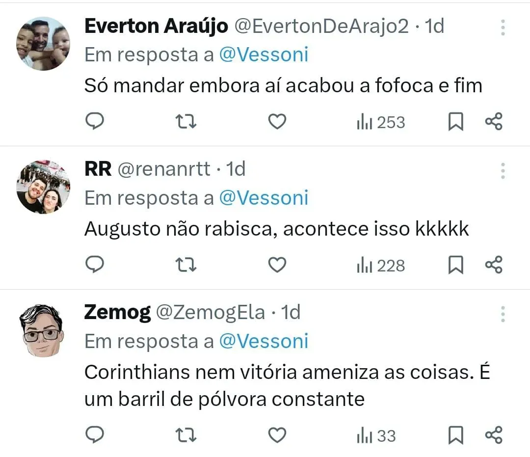 O colunista ainda afirmou que gestão de Melo decepciona os torcedores que esperavam mais do presidente. “Mas, pelo que estou vendo, a incompetência da gestão Augusto Melo só está piorando ainda mais a gestão destruidora de Duilio. A atual gestão me parece sem comando, com pessoas sem personalidade, e as incompatibilidades começam a aparecer a partir da vaidade e da falta de respeito pelas opiniões diferentes.”