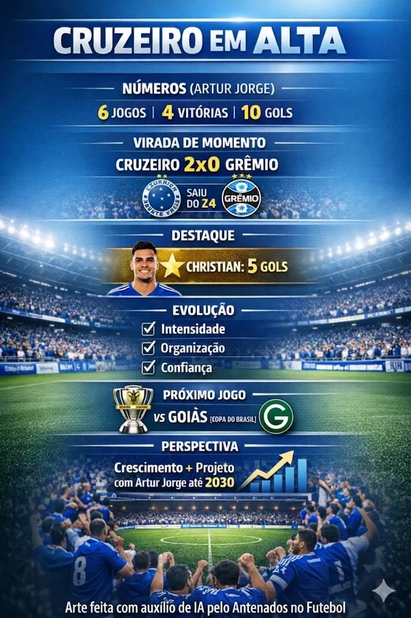 O Cruzeiro vive um momento de recuperação sob o comando do técnico Artur Jorge, que já apresenta números animadores neste início de trabalho. Em seis partidas, a equipe soma quatro vitórias e dez gols marcados, indicadores que refletem a rápida evolução dentro de campo.