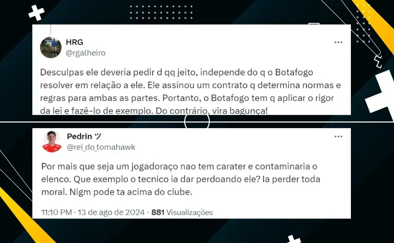 “Para o Mateo Ponte, não é um rojão, caiu um presente na mão dele, ele era reserva e vai poder jogar, tenho certeza de que ele vai comemorar. É um rojão para o Botafogo e para o Artur Jorge. E aí acho que é caso de ele pensar com calma, reavaliar… Se o cara quiser pedir desculpas, deixa ele pedir desculpas. Ele estava sendo muito importante”, disse.