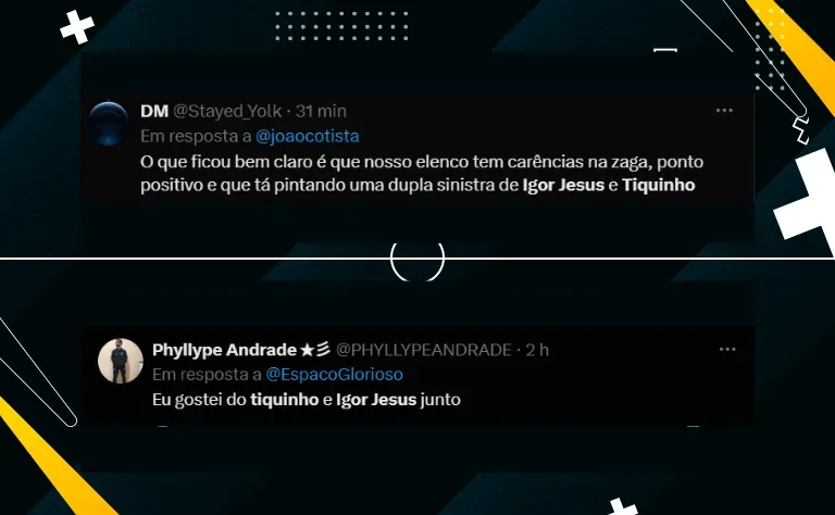“Era um ponto que me preocupava esse casamento Tiquinho e Igor Jesus pelas características, e hoje me pareceu absolutamente promissor, com o Tiquinho fazendo esse movimento de saída e o Igor Jesus de ataque ao espaço. É que o Igor Jesus não foi preciso na finalização, mas fez um bom jogo”, disse.
