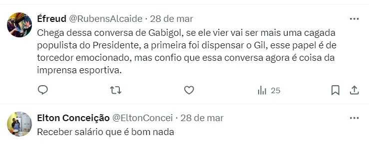 Vale lembrar que o Corinthians tem passado por muitas mudanças nos últimos tempos com a chegada de Augusto Melo no comando. Um dos objetivos do presidente é que o Timão tenha um time competitivo para a temporada. Aliás, um dos sonhos de consumo do mandatário era o centroavante Gabriel Barbosa, o Gabigol.