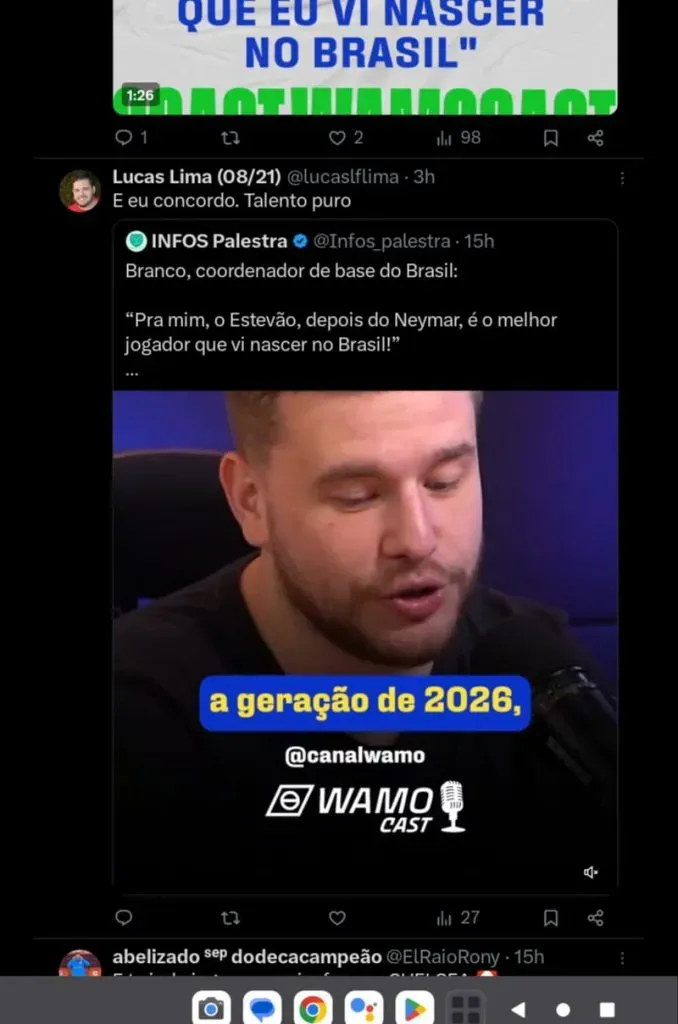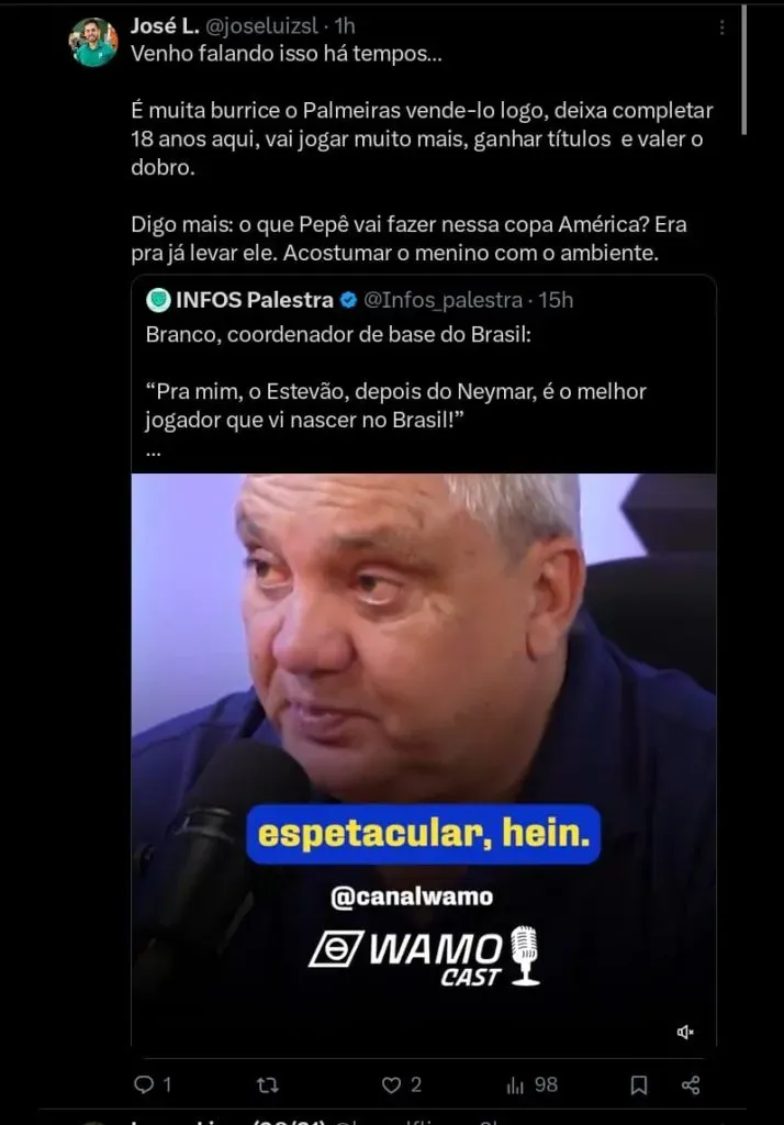 “Nós projetamos a base do Brasil até a Copa de 2030. Para mim, eu vi tantos… o Estêvão, com todo o respeito a todos os outros, depois do Neymar é o maior jogador que vi nascer no Brasil. Os outros são espetaculares, fenomenais… É uma opinião minha. Respeito todos, mas esse menino o sarrafo dele é um pouco mais alto”, disse ao canal Wamo.