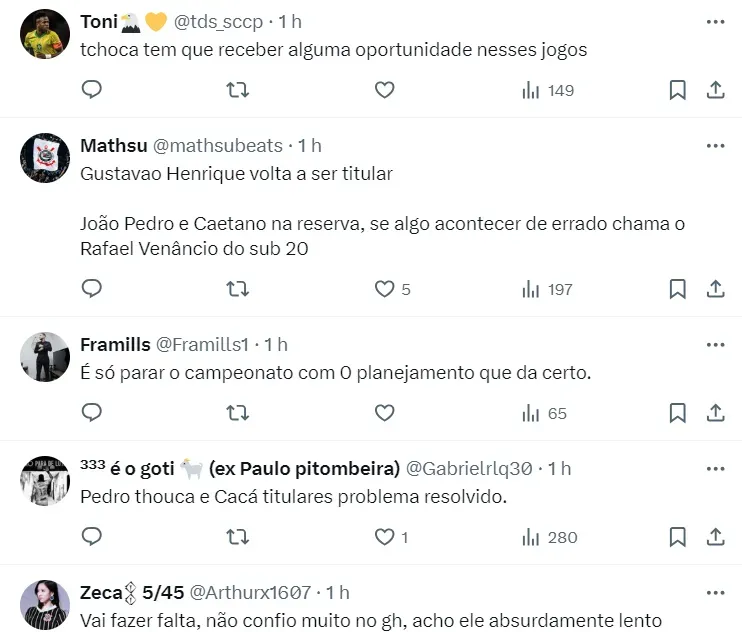 Apesar disso, agora, o Timão se prepara para o duelo contra o Botafogo, válido pela sétima rodada do Brasileirão. Nas próximas rodadas da competição nacional, o Alvinegro terá desfalques, como é o caso de Romero, que foi convocado para defender o Paraguai.