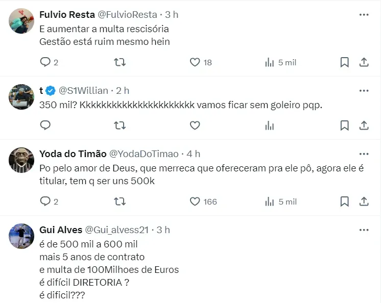 Vale lembrar que a atual multa rescisória do arqueiro é de 4 milhões de euros (R$ 22,5 milhões). Portanto, caso não renove e algum Clube decida pagar este valor, Carlos Miguel deixará o Parque São Jorge. Diante disso, o Corinthians insiste na renovação para se proteger de possíveis investidas do Oriente Médio.