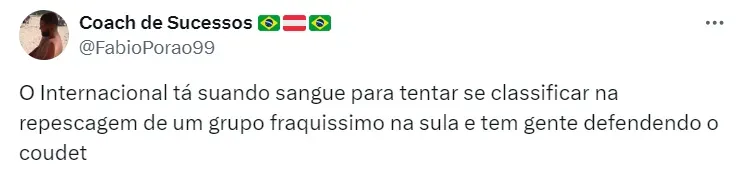 Em contrapartida, o tema do momento no Clube é Eduardo Coudet. Na semana anterior, o Inter foi derrotado pelo Belgrano por 2 a 1 e agora, briga por uma vaga nos play-offs da Sul-Americana. Recentemente, surgiu a informação de que o Colorado avaliava a possibilidade de ‘abrir mão’ da competição continental.