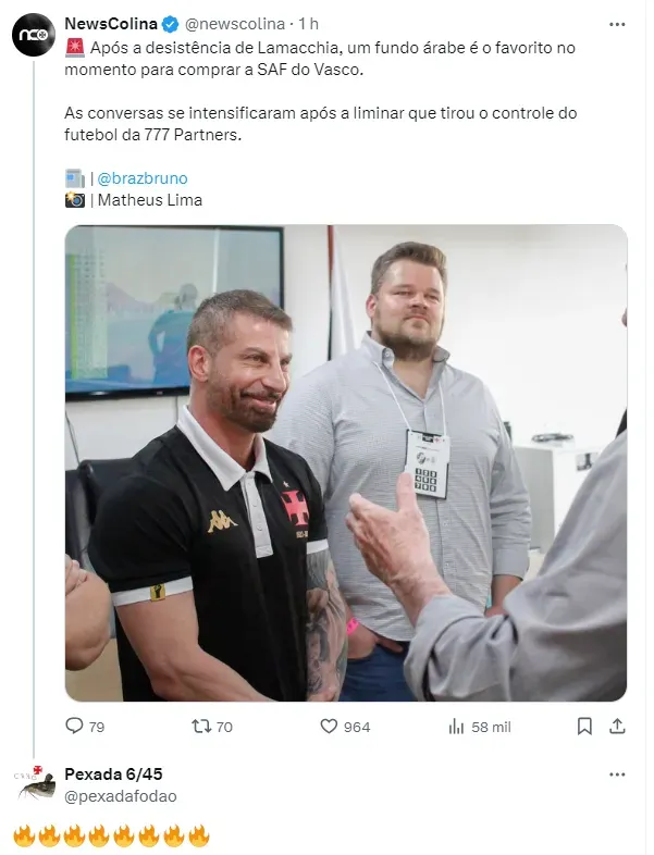 Por outro lado, segundo o jornalista Bruno Braz, também do UOL Esporte, o Vasco tem avançado nas tratativas com um fundo árabe para a venda da sua SAF. Vale destacar que, até o momento, não tem nada fechado.