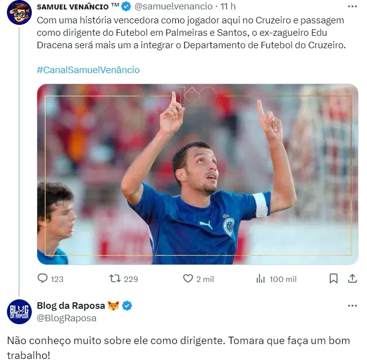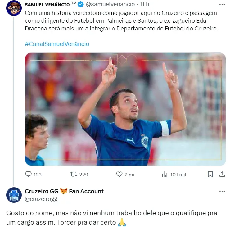 Em contrapartida, o tema do momento no Clube é Edu Dracena. De acordo com informações apuradas pelo jornalista Benjamim Back, o Cruzeiro acertou a contratação do dirigente para substituir Paulo Autuori no cargo de diretor técnico.