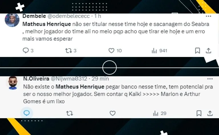 “Matheus Henrique não ser titular nesse time hoje e sacanagem do Seabra, melhor jogador do time ali no meio acho que tirar ele hoje e um erro mas vamos esperar.“, opinou um torcedor. “Não existe o Matheus Henrique pegar banco nesse time, tem potencial pra ser o nosso melhor jogador“, disse outro usuário.