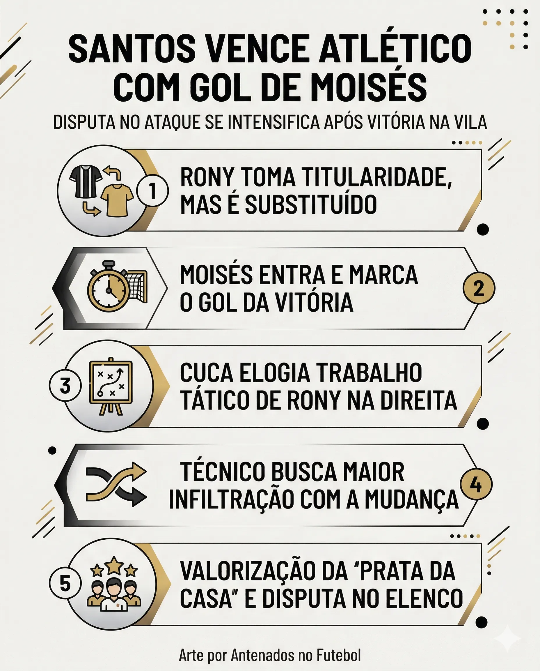O desempenho recente de Moisés indica que o jogador pode assumir a condição de titular no ataque do Santos. O atacante tem mostrado eficiência nas oportunidades recebidas e foi decisivo na última partida. Ainda assim, a decisão passa pelo equilíbrio tático buscado por Cuca, que valoriza diferentes características dentro do elenco.