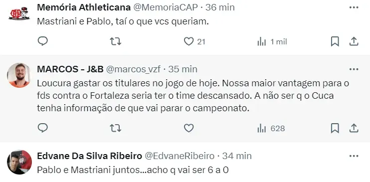 De acordo com informação trazida pela jornalista Monique Vilela, o comandante optou por escalar Mastriani entre os titulares, ao lado de Pablo no ataque da equipe. Algo que agrada bastantes os torcedores, que vinham pedindo este teste ao treinador.