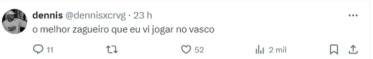 “A torcida do Vasco, o que eles fizeram na minha vida e na minha carreira foi absurdo. Na seleção, o que mais tocou no coração do treinador foi a torcida falando: ‘Irmão, leva o Dedé para testar’. O Mano deu uma entrevista, e eu não tinha sido convocado, e falou que o jogador que mais pedem é o Dedé. Isso em prol da torcida do Vasco. A torcida do Vasco é f…”, revelou.
