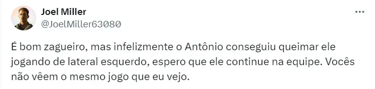 Tanto que, o defensor sequer foi relacionado pelo treinador para as duas últimas partidas oficiais da equipe (ficou de fora da Copa do Brasil e Sul-Americana). Vale lembrar que o contrato dele é válido somente até o final do ano.