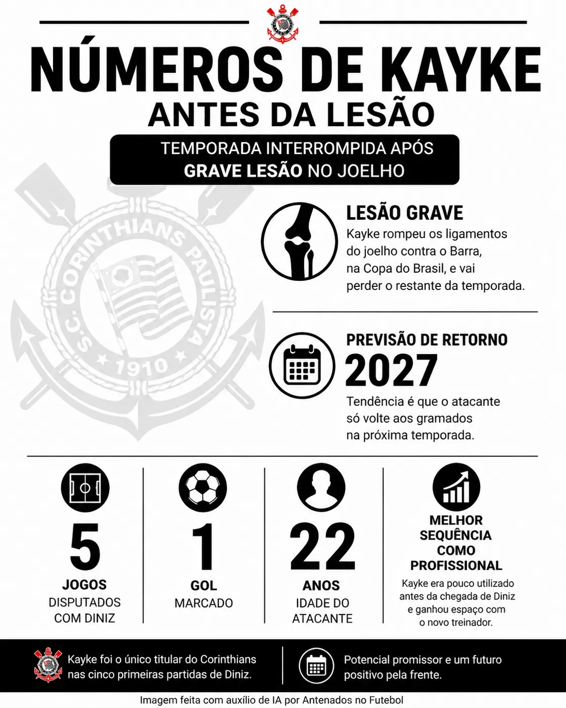 O atacante, de 22 anos, estava esquecido no Corinthians antes da chegada de Fernando Diniz. Com o novo treinador, o ponta teve sua maior sequência como profissional, e a expectativa era que seguisse jogando, mas acabou sofrendo uma grave lesão contra o Barra, na Copa do Brasil, e a tendência é que só volte em 2027.