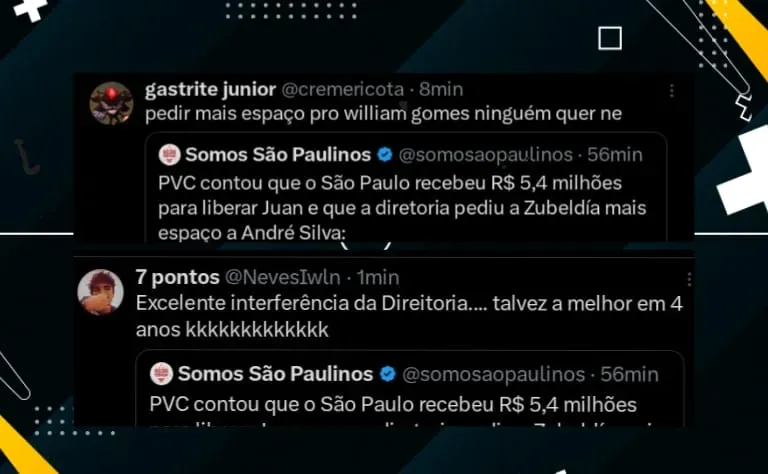 “Um bastidor da venda do Juan. Por que o Juan, que tinha assinado pré-contrato com o Southampton, foi liberado pelo São Paulo por 900 mil euros, e por que o Wellington não foi? Primeiro, a razão óbvia, o Wellington é titular do São Paulo, foi titular contra o Nacional, então o São Paulo não poderia liberar um jogador que é titular. Segundo, porque o Juan falou para o Zubeldía que queria ir embora, assinou um pré-contrato com o Southampton e foi emprestado para Turquia, até jogou por lá”, finalizou o jornalista.
