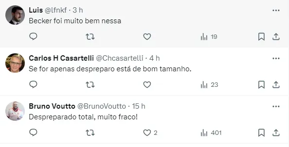 Outro assunto que repercutiu nas redes sociais foi a atuação da arbitragem de Anderson Ribeiro Gonçalves, que não expulsou o jogador do Cuiabá em entrada em Rochet. O dirigente gaúcho Felipe Becker ‘detonou’ árbitro e fez duras críticas a CBF após o jogo.