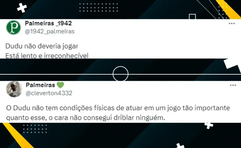 “Dudu não deveria jogar esse jogo, está lento e irreconhecível, porém, espero que mostre o contrário e dê conta do recado”. “É o jogo da vida para o nosso camisa 7, ele vai ter que dar tudo de si para mostrar que ainda pode ser uma peça importante do time”.