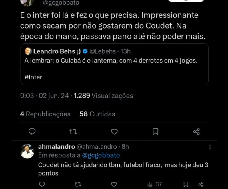 O Colorado melhorou muito após o intervalo. Diante disso, o treinador Eduardo Coudet falou sobre as alterações que deram certo: “Tentaremos que todos joguem, precisamos de todos. É a verdade. Óbvio que ainda não temos o ritmo que precisamos. Acha que foi normal o ritmo do jogo anterior ou do primeiro tempo? Melhoramos muito no segundo”, disse.