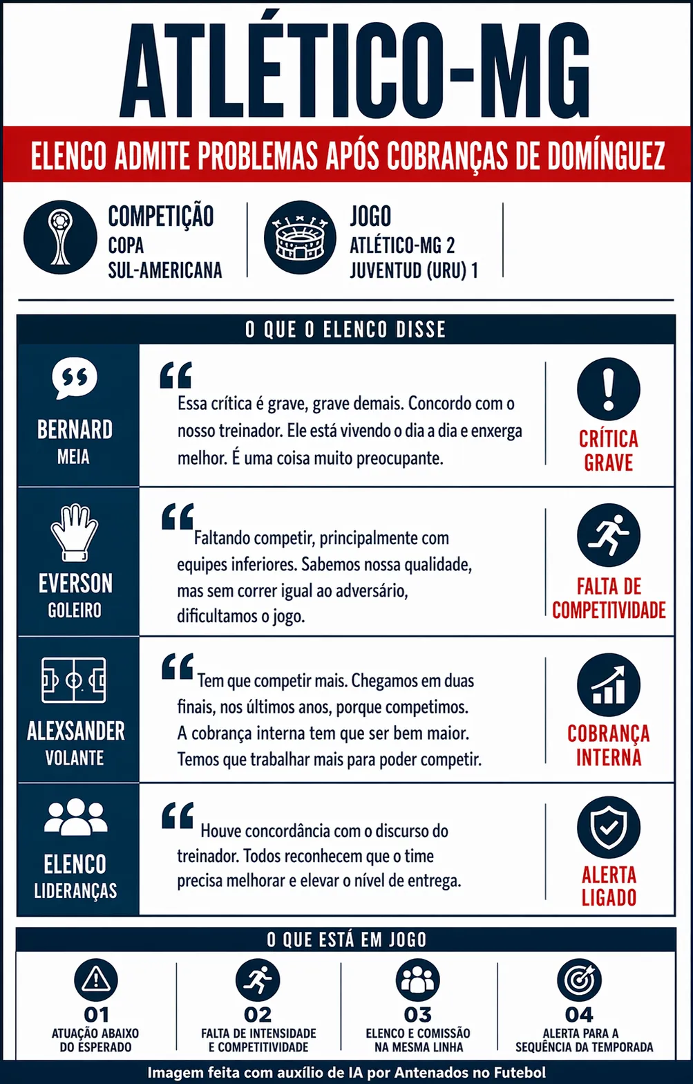 Após o jogo, o treinador atleticano disparou fortes cobranças ao elenco, chegando a dizer que ‘não saiu feliz’ com a vitória. Em resposta, grande parte das lideranças do plantel do Galo concordou com a fala do técnico argentino.