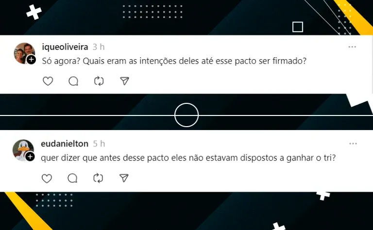 “A palavra pacto eu ouvi conversando com uma fonte que não é do elenco, mas é do corpo da Academia de Futebol. Então vale dizer que é ou ganha ou ganha? Não se trata disso e também não é como a torcida organizada foi pra Campinas gritar ‘Brasileirão agora é obrigação’. Eu diria que a palavra exata é compromisso”, iniciou PVC.