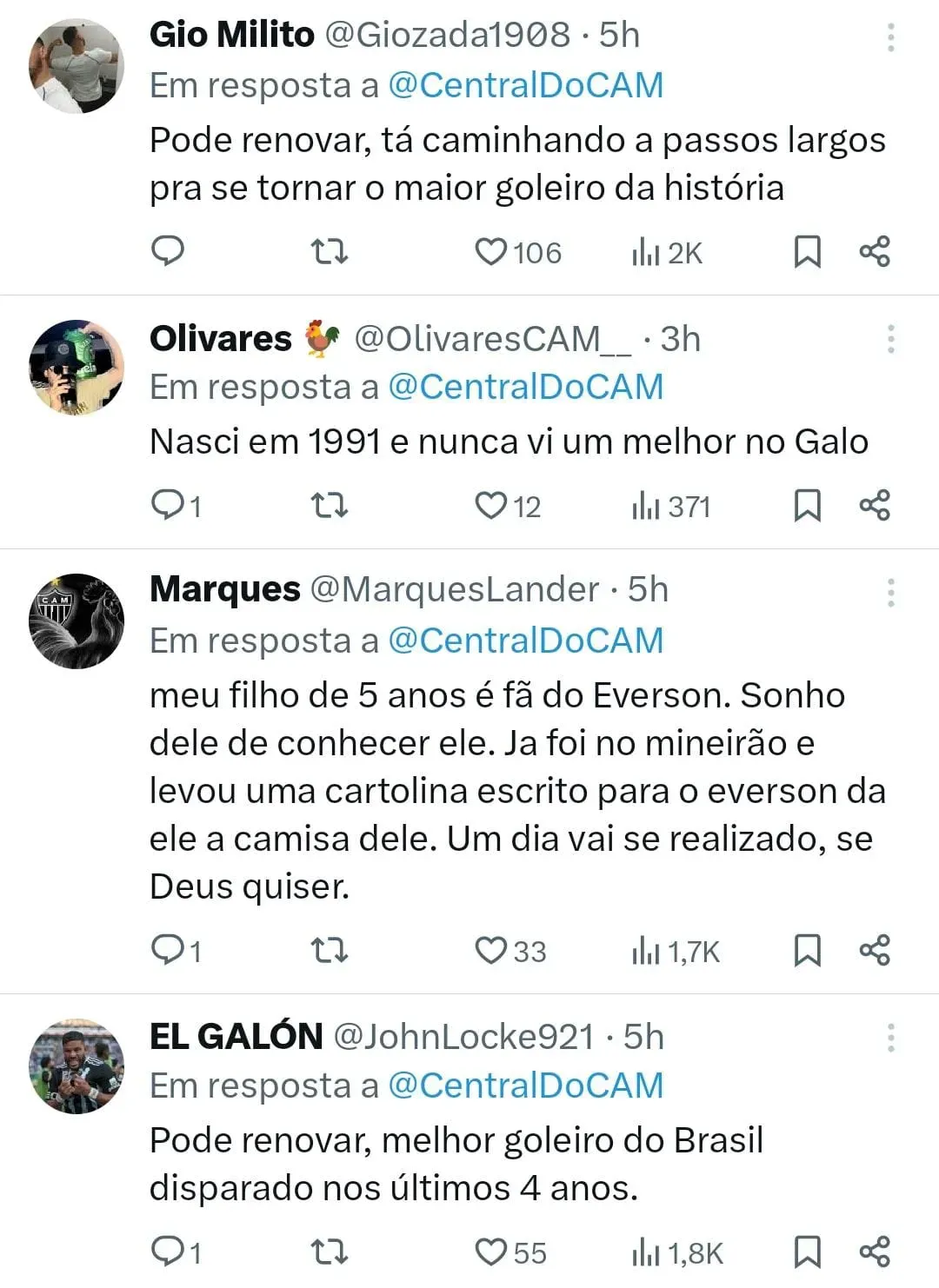 “Sou muito feliz aqui no Atlético. Todos sabem do carinho que eu tenho pelo Clube. Com certeza, se for da minha vontade, eu pretendo terminar a minha carreira aqui. Pretendo renovar o meu contrato. Logicamente, dando títulos, vitórias e continuando escrevendo essa linda história. Se depender do Everson, a gente vai renovar por mais tempo, para que eu possa continuar aqui no Clube dando alegria ao torcedor. Espero que a vontade da diretoria seja recíproca”.