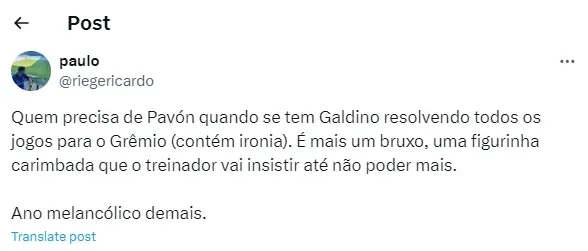 “Quem precisa de Pavón quando se tem Galdino resolvendo todos os jogos para o nosso time (contém ironia). É mais um bruxo, uma figurinha carimbada que o treinador vai insistir até não poder mais”. “Esse cara é um baita bagre, não pode mais jogar aqui”.