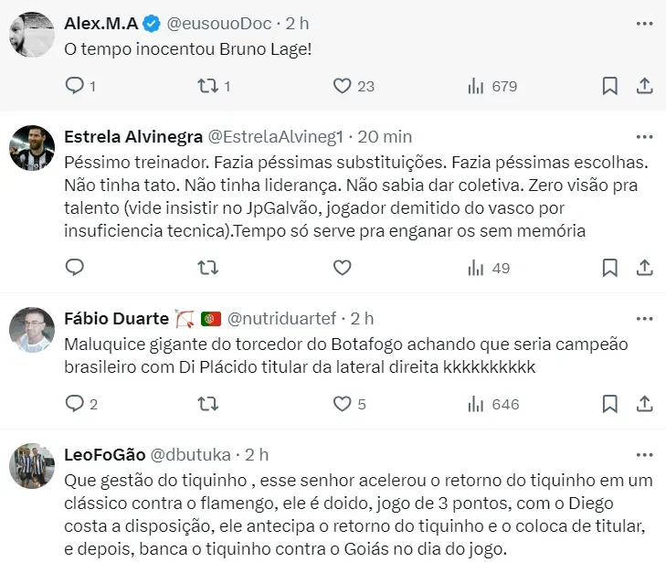 “Não me arrependo. É necessário entender o contexto. John Textor apresentou-me uma proposta para substituir o Luís Castro, que deixou o Botafogo na 12ª rodada, líder com sete pontos de vantagem. Entre assinar os documentos e obter os vistos, o Cláudio Caçapa realiza três jogos do Brasileirão, vence-os e aumenta para 12 pontos a vantagem para o segundo lugar”, disse.