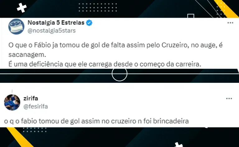 “O que o ele já tomou de gol de falta assim pelo Cruzeiro, no auge, é sacanagem. É uma deficiência que ele carrega desde o começo da carreira”. “O cara é um baita goleiro e tudo mais, porém, não pode levar um gol assim”. “Reinaldo cruzou a bola e o veterano deixou passar, que lambança!”.