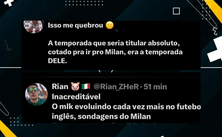 (SIC): “Inacreditável! O moleque evoluindo cada vez mais no futebol inglês, sendo sondado pelo Milan e acontece uma fatalidade dessa”, disse outro. Em relação ao Milan, na manhã deste sábado (17), o UOL Esporte trouxe a informação de que o Nottingham se preparava para receber propostas pelo volante.