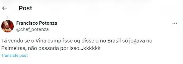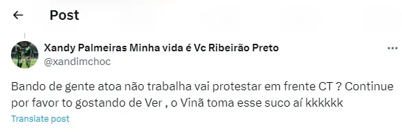 “Esse aí merece, não respeitou o Verdão e já está sofrendo no Rio de Janeiro”. “O cara foi aquele famoso judas, espero que a situação por lá não melhore”. “Ele zombou do nosso clube, com isso, espero que não tenha vida fácil por lá”.
