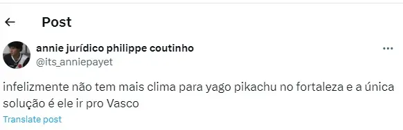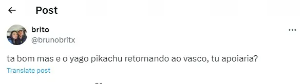 Isso porque, depois dos torcedores verem Yago Pikachu triste ao ser derrotado pelo Almirante, a torcida vascaína agiu rápido e tratou de convidar o jogador para atuar no Gigante da Colina. Sendo assim, os seguintes comentários estão bombando na web (SIC).