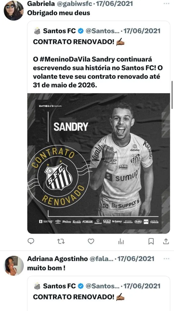 No último final de semana, ele atuou na partida do Sub-20 contra a Portuguesa Santista, no CT Rei Pelé. Sandry é um jogador formado nas categorias de base e era visto como uma promessa.
